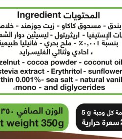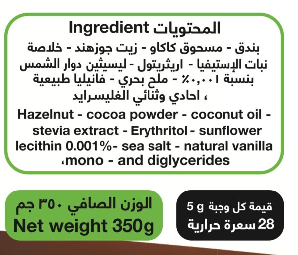 | | Ingredients: Cocoa Powder - Coconut oil- Hazelnut 30%- Skimmed Milk Powder-stevia leaves extract- sea salt-Garcinia- natural vanilla